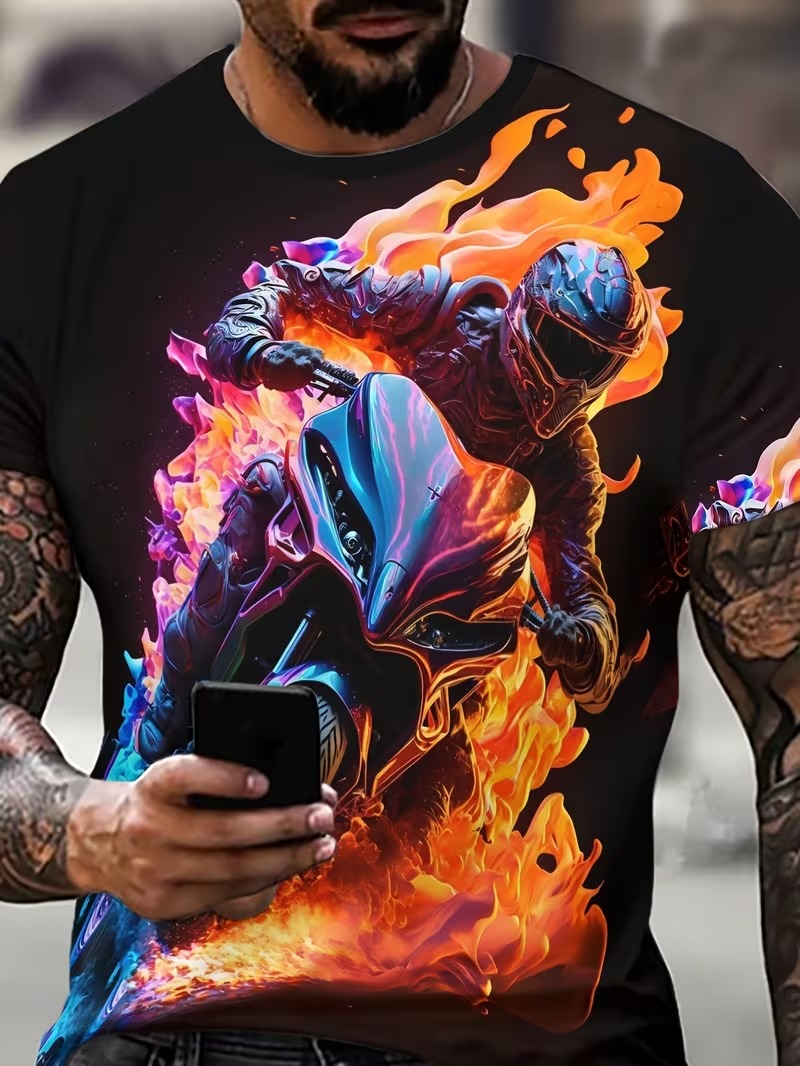 3D motion motorcycle pattern short-sleeved t-shirt for men, oversized casual t-shirt for summer, fitness and leisure wear for men, printed shirt, extra-large size