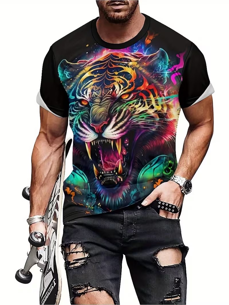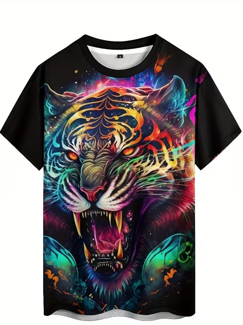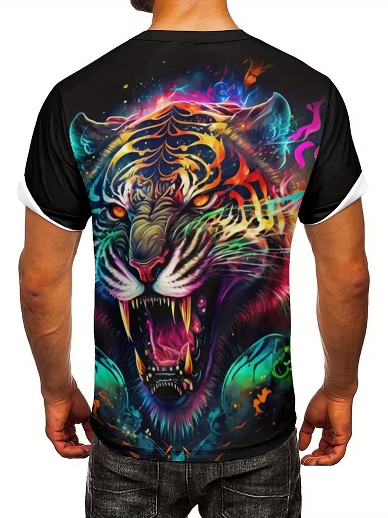 National style men's animal tiger 3D printed short-sleeved T-shirt for vacation, travel, and casual wear. Splashed ink design. Breathable and comfortable fabric. Umeda style. Fun geometric patterns.
